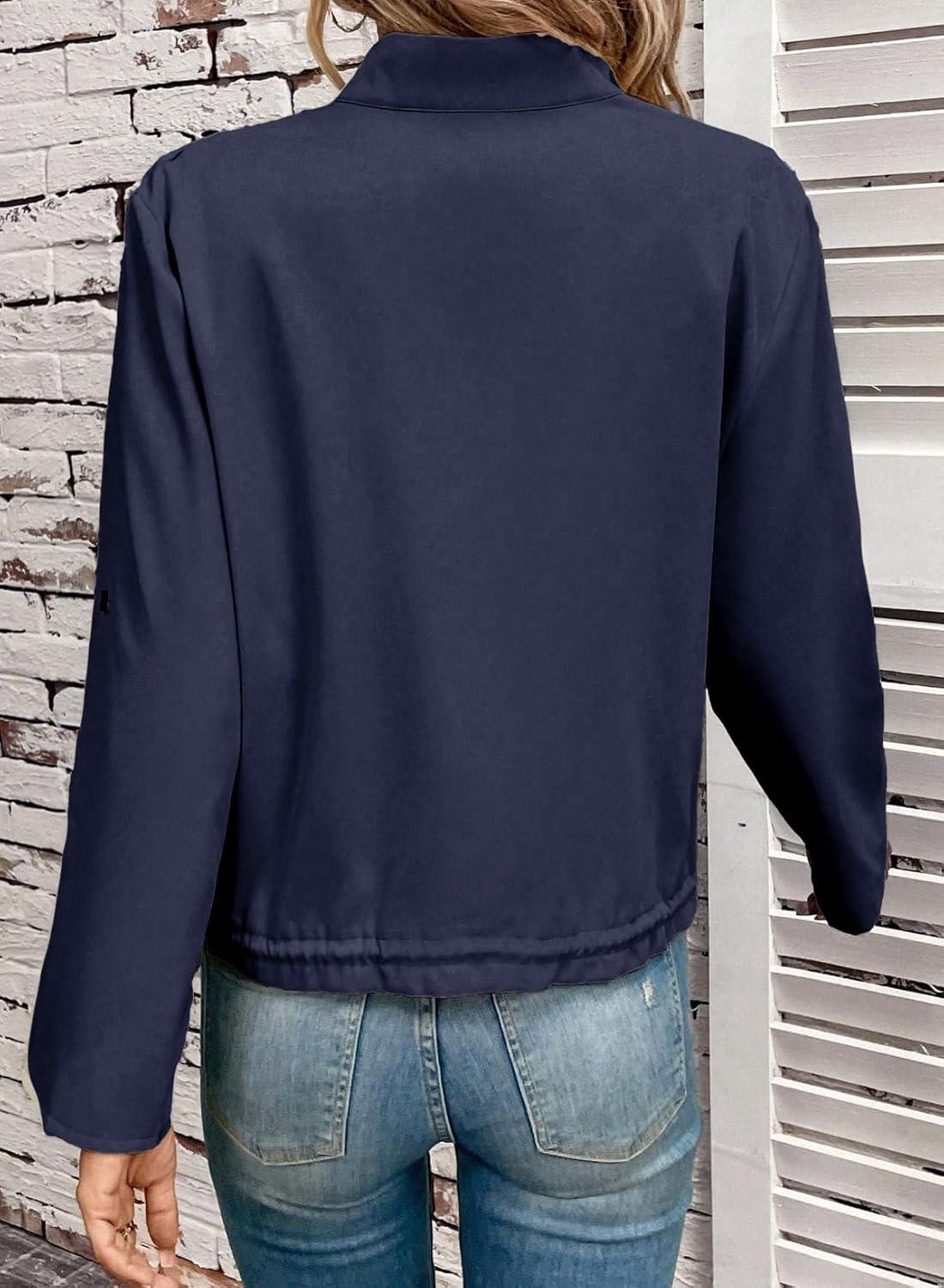 EVALESS Womens Zip Up Jacket Roll Tab Sleeve Flap Pocket Drawstring Hem Utility Lightweight Cropped Jackets(Navy Blue)