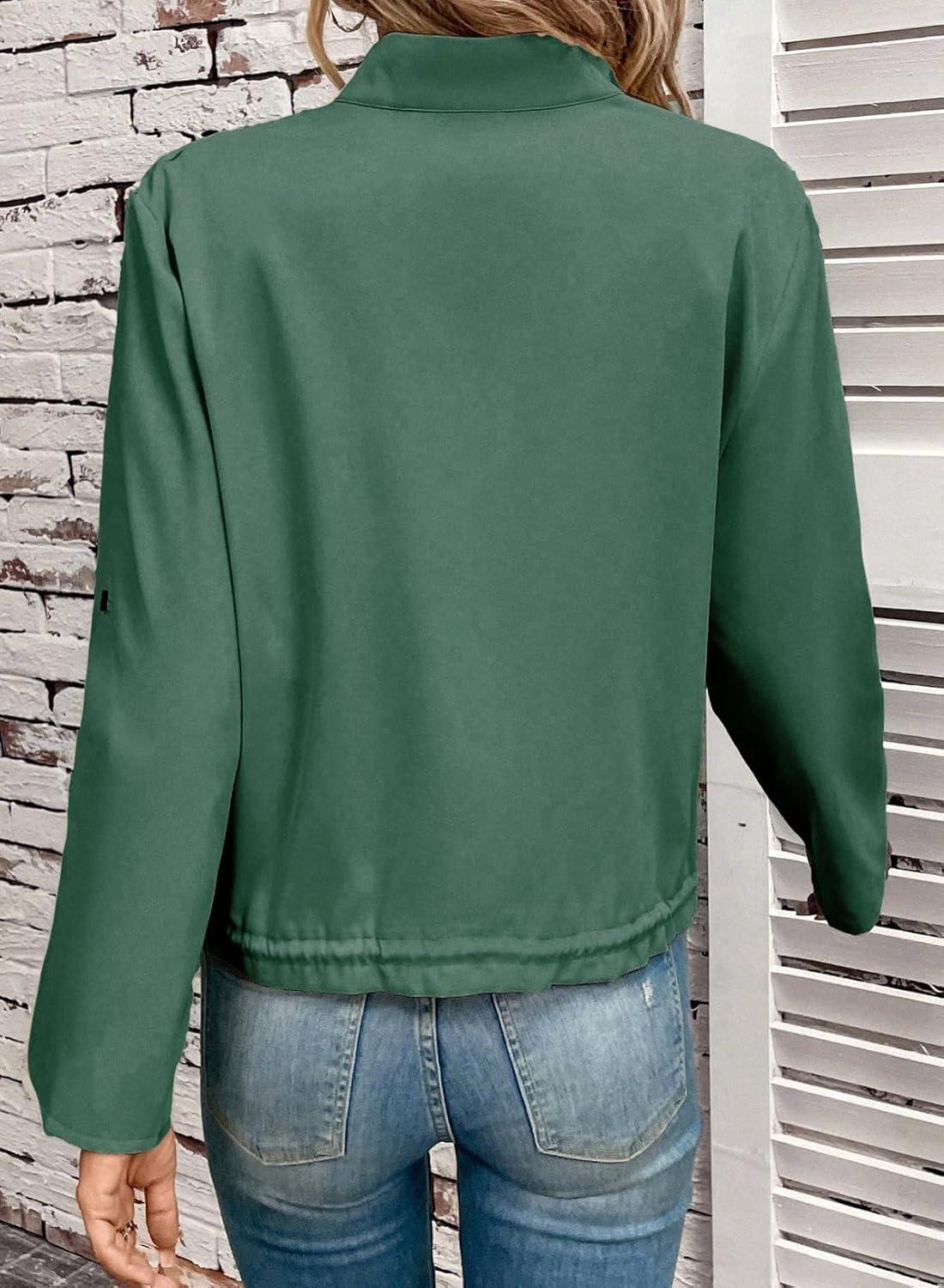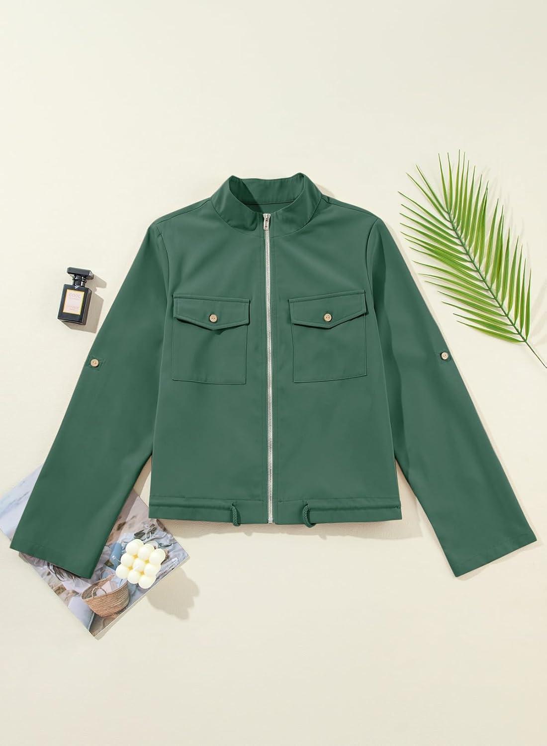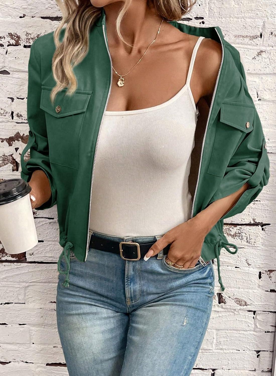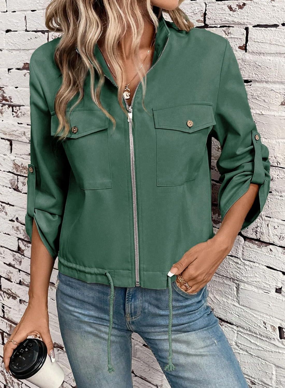 EVALESS Womens Zip Up Jacket Roll Tab Sleeve Flap Pocket Drawstring Hem Utility Lightweight Cropped Jackets(Sea Green)