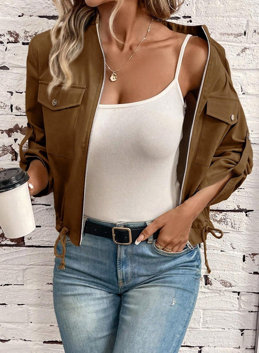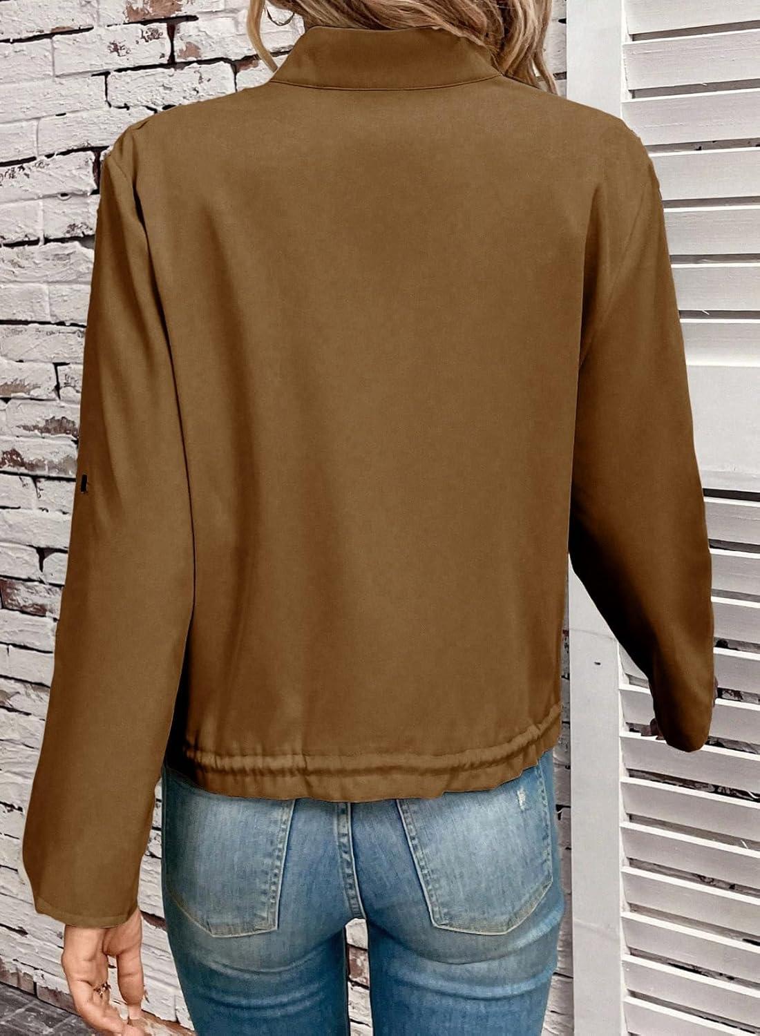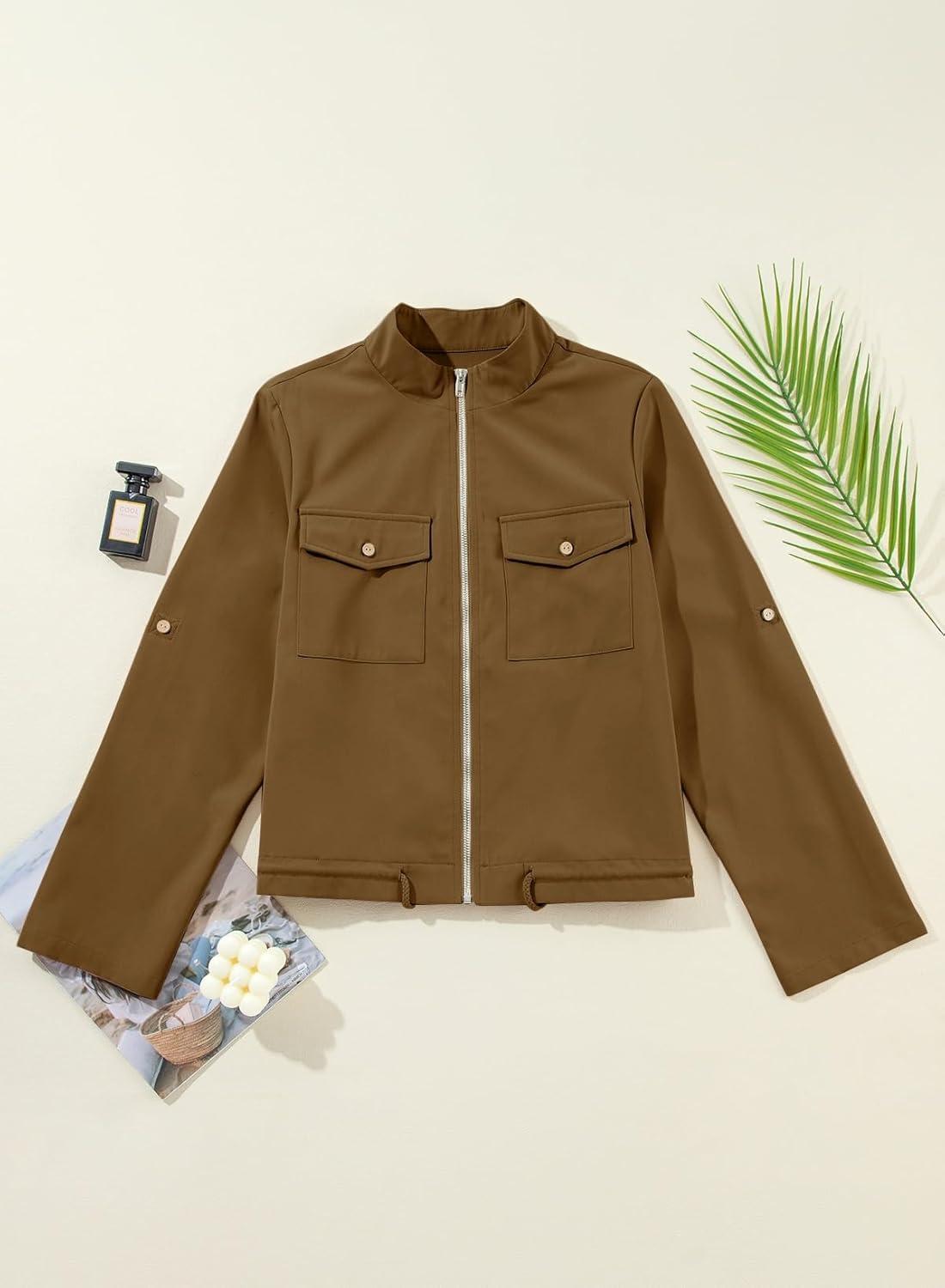 EVALESS Womens Zip Up Jacket Roll Tab Sleeve Flap Pocket Drawstring Hem Utility Lightweight Cropped Jackets(Sepia)